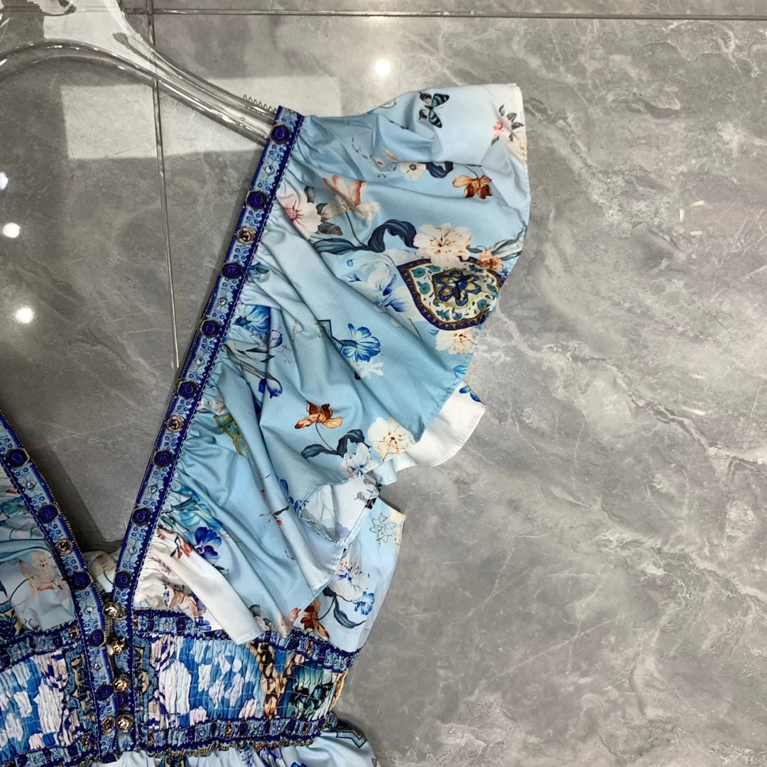 • CAMILLA* Double V-neck lotus sleeve waist print skirt