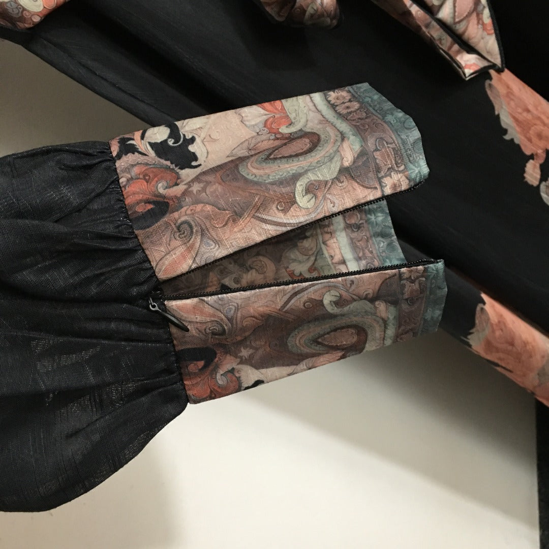 • Zimmerma** Retro Flower Print Tie Waist Lantern Long Sleeve Dress, Black